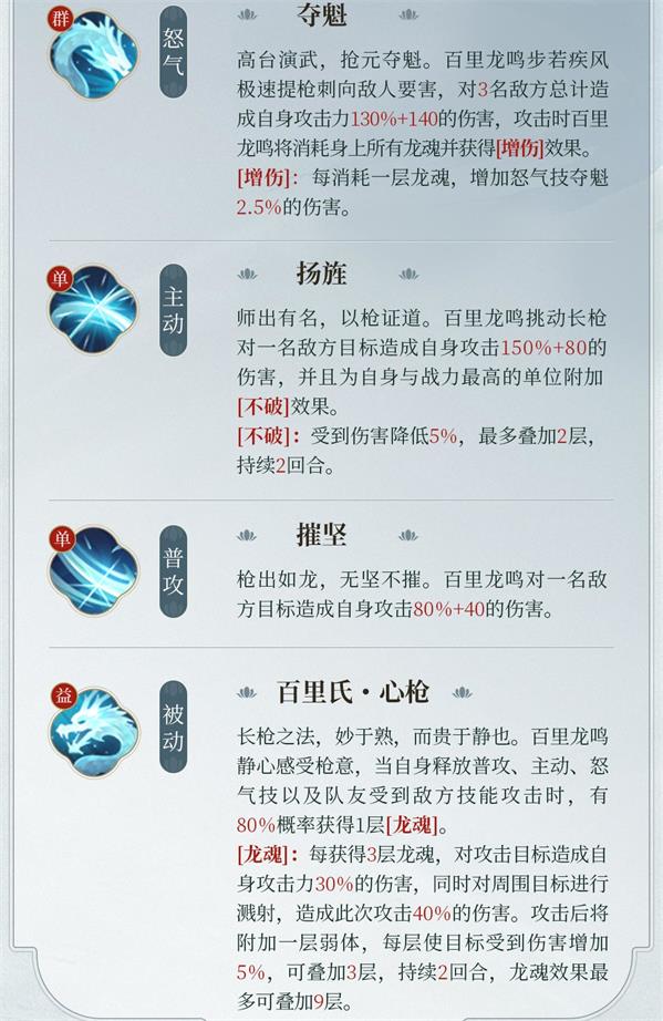 浮生忆玲珑百里龙鸣技能是什么?胤中雷州百里氏,为江湖公认的枪法一流的走镖世家。百里龙鸣是小公子,但受外戚夺权陷害被迫离家,一路辗转流落至汴京,留给他的,只有一杆世代传承的长枪,百里龙鸣常会独自一人前往山林间,体会林中静谧感受枪刃劈风。舞枪仍是他最爱的事,不过没想到这