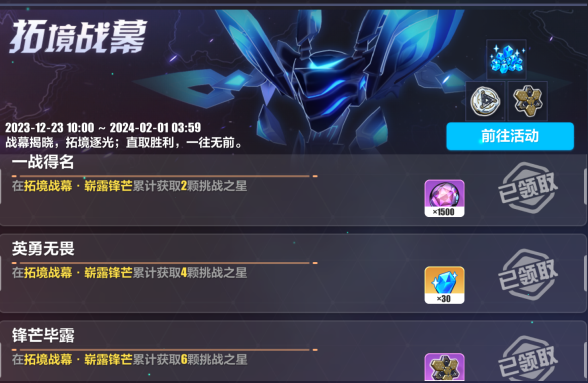 崩坏三拓境战幕崭露锋芒怎么打?自身配置不够,先打完全部小关卡,小关卡全部提供试用,且时间充裕,关底的极境试炼用自己的角色打通关即可就有9个挑战之星,不需要120秒内击杀,自身配置正常,就足够打满极境试炼,那么小关卡只需要打6关就行,没有日常,大部分战斗关限时4分钟,大部分战