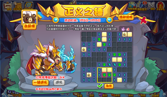 洛克王国正义之锤怎么过?本期VIP专属活动,小洛克们通过雷霆妙尔尼的考验,就可以开启他的进化资格哦,另外此阶段可以破茧重生,成为苍雷妙尼尔,这个活动也可以算本周最难的一个活动了,不过玩法大家应该会比较熟悉,就是以前电脑自带的扫雷,按照九宫格的方法去逐个分析,慢慢的就能标