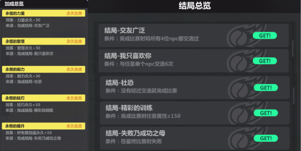 崩坏学园2网球训练大师普通结局怎么达成?看似普通但是其实很难达成的“普通比赛”结局,需要数值够高从而至少吃到一个BUFF(力量为所有网球分数双倍,智慧为网球速度变低,毅力为丢球30个才失败,技巧为弧线球分数增加很多)才可能过关,但是这个数值具体多高现在还不是很明确,个人推测可