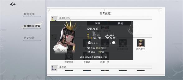 宿命回响弦上的叹息萨巴女王技能怎么样?萨巴女王拥有全游戏最高的魔攻基础数值,以及独特的追击机制,但是身板脆弱,全游戏倒数第一速度71速,无自身保命手段,容易暴毙,如果萨巴女王开启巅峰独奏,并且此时拥有六层整备。是先进行巅峰独奏,然后再使敌方全体魔抗降低20%,最后再发动追