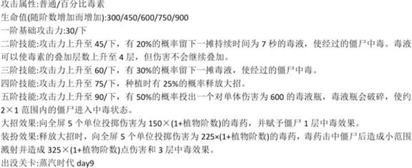 植物大战僵尸2芦藜药师厉害吗?当有僵尸出现在芦黎药师前方时,芦黎药师会以约 2.9 秒 下的频率投掷毒药。芦袭药师的攻击附带可以根据僵尸的最大生命值减少其当前生命的毒素并使之减速。毒素叠加层数上限为 3,每层 1%,持续5秒,毒液与僵尸每接触一秒就会为僵尸叠加一层毒素,僵尸进入4 层中
