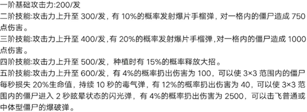 植物大战僵尸2桑葚爆破手厉害吗?大招效果是向全屏发射6发伤害为135x(1+植物阶数)的手榴弹,装扮效果是释放大招时,向全屏发射6发伤害为135x(1+植物阶数)的手榴弹,有概率发射伤害为175x(1+植物阶数),范围为3x3的手榴弹,出没关卡为蒸汽时代days9,11,非五阶在无尽中无用,五阶后在无尽中是TO级别的