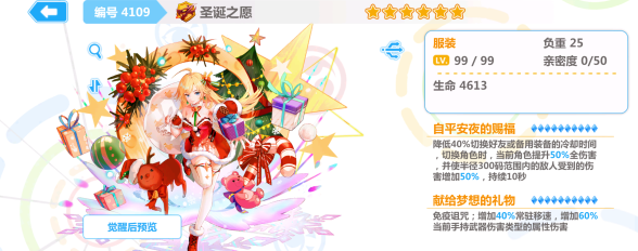 崩坏学园2圣诞之愿值得抽吗?一技能,降低切换助战的冷却时间;切换角色时获得全伤,使一定范围内的敌人受到的伤害增加,二技能,增加手持武器对应的属性伤害无属性视为物理,免疫诅咒,增加常驻移速,是骑在游戏机制上的装备,前者在能切备用的高难关卡,比如斯坦因秘境和幻海,基本是最