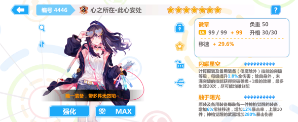 崩坏学园2心之所在值得抽吗?成本极高的装备,要求全身装备都是高破度且神格觉醒装备越多越好。七星之后还可以通过备用装备计算加成。且如果把它放在备用也会给备用装备提供20点突破等级,目前加成很高的通用徽章,但对装备要求极高,除了基础的加成外22.88(33.58),20的破度提升也有一定的
