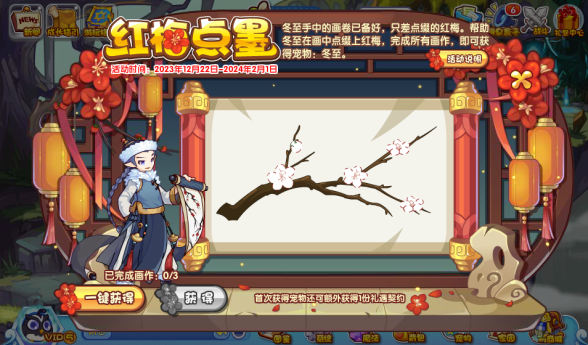 洛克王国红梅点墨怎么玩?又是一年冬至啦,小洛克们来找冬至小哥哥完成画作吧,活动开始前,作画怎么能没有画笔呢,先挑战笔童获得毛笔吧,等待两分钟进行作画,累计完成三次画作,就可以完成活动,获得冬至,BOSS笔童500HP、无防控,冬至1500HP、防控,活动逃跑、失败不影响任务进度,推荐立