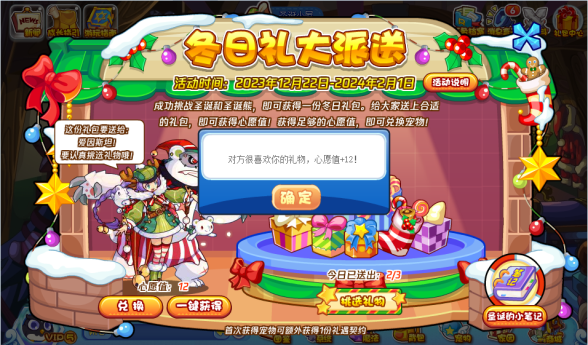 洛克王国冬日礼大派送怎么玩?圣诞去年的活动返场,小洛克们快来帮助圣诞挑选礼物并赠送出去吧,当心愿值达到100可兑换:圣诞熊,当心愿值达到140则可迎娶圣诞,BOSS圣诞1500HP、防控,圣诞熊1450HP、防控,推荐立冬为首的斩杀流上场,逃跑不影响活动完成,也可以魔武、苍羽直接硬刚,活动会一直