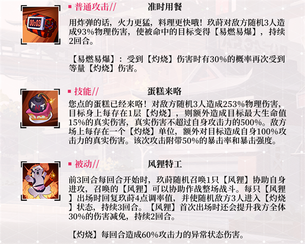 绯色回响玖莳技能是什么?哦,要选我做秘书嘛,我知道啦,玖莳一定尽心尽意为主人您服务,她一共有三个技能,分别是准时用餐、蛋糕来咯和风狸特工,万事屋雅里面的女仆,看似普通,实际上是十字蕾丝结社的重要成员之一,这个看似女仆同好会的组织实际上有着极宽广的人脉,性格热情开朗的