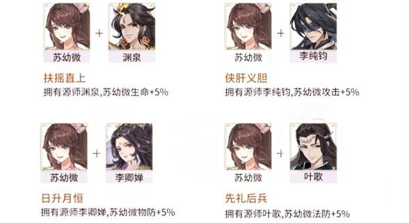 元尊手游苏幼微缘分有哪些?这游戏很吃缘分,许多源师强度也是因缘分而拉升,并延升到了配阵、组合等合作玩法,缘分分为上阵缘分与集卡缘分其中上阵缘分提升最大,往往会绑定一个羁绊最深的角色双方获取全新效果,有合击、有特殊联动等等,一般绑定越深,契合度强度也就越深,比如我们本