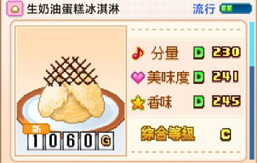 创意蛋糕店生奶油蛋糕冰淇淋怎么制作?生奶油蛋糕冰淇淋在创意蛋糕店里分量二百三十,评级为D,美味度二百四十一,评级D,香味二百四十五,评级D,综合C,一共一千零六十克,生奶油蛋糕冰淇淋在游戏中的一、七、八、十一月份流行,流行月份一共四个,无微妙,奶油的甘醇柔嫩、蛋糕胚的松软