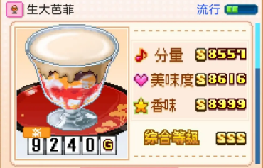 创意蛋糕店生大芭菲怎么制作?你还在苦恼田先生因为人气不够而无法获得小秘的终极巧克力嘛,有了这个食谱摆满七个货架轻轻松松3900人气告别人气不够的烦恼,生大芭菲在创意蛋糕店里分量八千五百五十七,评级为S,美味度八千六百一十六,评级S,香味八千九百九十九,评级S,综合SSS,一共九千