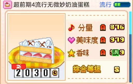 创意蛋糕店超前期4流行无微妙奶油蛋糕怎么制作?超前期4流行无微妙奶油蛋糕在创意蛋糕店里分量八百七十六,评级为A,美味度九百七十九,评级A,香味满级,评级A,综合S,一共两千零三十克,超前期4流行无微妙奶油蛋糕在游戏中的一、五、六、十一月份流行,流行月份一共四个,是不是已经迫不