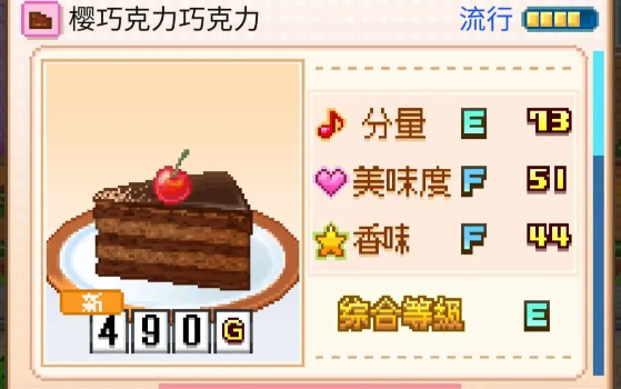 创意蛋糕店樱巧克力蛋糕怎么制作?樱巧克力蛋糕在创意蛋糕店里分量七十三,评级为E,美味度五十一,评级F,香味四十四,评级F,综合E,一共四百九十克,樱巧克力蛋糕在游戏中的二、三、四、十一、十二月份流行,流行月份一共五个,无微妙,樱桃誉为水果中的钻石,其含铁量是苹果的二十到三