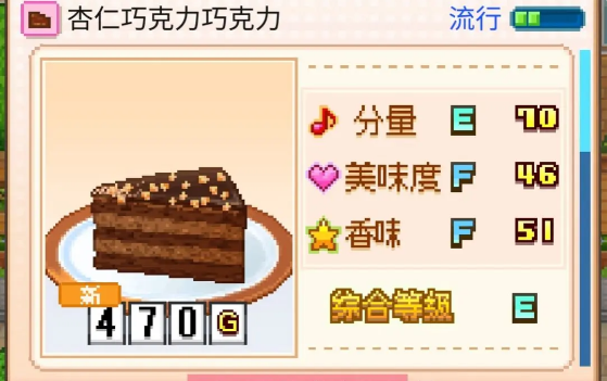 创意蛋糕店杏仁巧克力蛋糕怎么制作?杏仁巧克力蛋糕在创意蛋糕店里分量七十,评级为E,美味度四十六,评级F,香味五十一,评级F,综合E,一共四百七十克,杏仁巧克力蛋糕在游戏中的二、七、九、十一、十二月份流行,流行月份一共五个,无微妙,弥补了樱巧克力蛋糕七、九月没有流行,是不是
