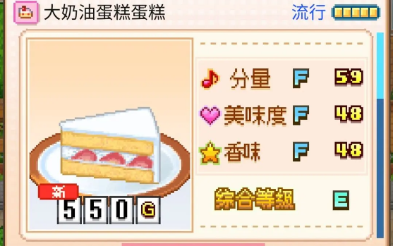创意蛋糕店大奶油蛋糕怎么制作?大奶油蛋糕在创意蛋糕店里分量五十九,评级为F,美味度四十八,评级F,香味四十八,评级F,综合E,一共五百五十克,大奶油蛋糕在游戏中的一、五、六、十一月份流行,流行月份一共四个,奶油蛋糕是一种非常受欢迎的甜点,由于其松软的面质和丰富的奶油装饰,