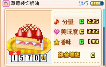 创意蛋糕店草莓装饰奶油怎么制作?草莓装饰奶油在创意蛋糕店里分量二百三十五,评级为D,美味度三百三十二,评级C,香味一百九十八,评级D,综合C,一共一千五百七十克,草莓装饰奶油在游戏中的三、四、五、六、八、十二月份流行,流行月份一共六个,现在的食客更喜欢纯白或糖果色系的蛋糕