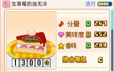 创意蛋糕店生草莓奶油无冷怎么制作?生草莓奶油无冷在创意蛋糕店里分量二百六十七,评级为D,美味度五百五十二,评级B,香味二百八十八,评级D,综合C,一共一千三百克,生草莓奶油无冷在游戏中的一、五、六、十一月份流行,流行月份一共四个,现在的食客更喜欢纯白或糖果色系的蛋糕,简约