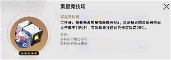 崩坏星穹铁道青雀内圈用繁星的竞技场怎么样?“繁星的竞技场”是青雀毕业最优解之一,它提供了一个珍贵的8%暴击率,并且能够在使用正常的暴击率(70%)的情况下提高普攻和战技造成伤害。对于那些追求更高输出的玩家来说,这是一个非常有用的属性。“繁星的竞技场”作为内圈二件套,是目前