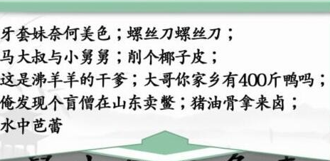汉字找茬王空耳神曲怎么过?进入汉字找茬王空耳神曲关卡后,横着映入眼帘的有“发现个盲僧螺丝刀”、“俺皮吗马牙在卖鳖螺”和“削个大套山东刀丝”等不通顺的句子,竖着看则有“发俺削个大哥你家”、“现皮子椰舅舅有乡”和“个马大叔与小400爹”等不通顺的句子,这样看是不是已经想起来