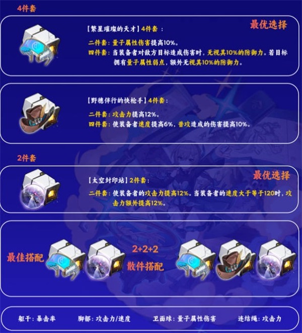 崩坏星穹铁道青雀遗器可不可以用繁星璀璨的天才?「繁星璀璨的天才」(俗称量子套)四件套是一种专为青雀设计的装备,因其强大的量子属性增伤和高贵的无视防御能力而备受推崇。这个套装在提高青雀对量子弱点敌人的打击能力方面表现出色,是当前版本最适合青雀使用的毕业套装。量子套四件