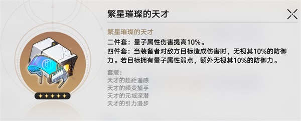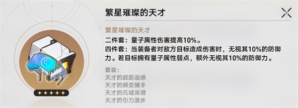 崩坏星穹铁道青雀用的量子套是什么?【繁星璀璨的天才】这个遗器是一种具有独特效果的装备,可以让青雀的量子属性伤害更加强大。当青雀装备了两件套时,青雀可以直接提升量子属性技能的伤害,让青雀在攻击时更加犀利。而当青雀装备了四件套时,青雀可以无视目标怪物10%的防御属性,让青雀