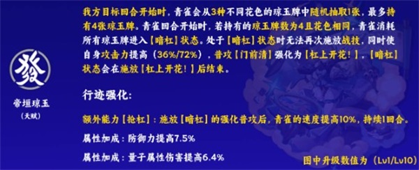 崩坏星穹铁道青雀天赋是什么?青雀的天赋名为帝恒琼玉,该天赋在其每个角色回合开始时启动。青雀会随机抽取一张牌,同时可以触发星魂的二命,并恢复一点能量。这个天赋是青雀的核心机制,琼玉牌共有四种花色:【万字】、【文钱】、【索子】、【幺鱼】,其中【幺鱼】不属于天赋的牌种范畴
