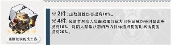 崩坏星穹铁道驭空用盗匪荒漠的废土客效果是什么?废土套是非常优秀的套装,但是在使用时需要配合能够造成负面效果的角色。在此基础上,推荐与同为虚数的瓦尔特进行组队,因为驭空行迹中的额外能力【迟彝】能够为全队虚数角色增加12%的属性伤害。在能够保证驭空处于队伍释放技能的第一位的