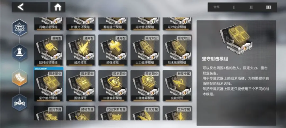 银河境界线坚守射击模组怎么样?可以反击周围四格的敌人,限定火力、狙击职业装备,这就是坚守射击模组的属性,坚守射击模组一看就像防御型模组,从两个正方形的框框变成了四个,也对应了四格,实用度可以给一颗星,激励、再生、汲取、精准、闪避、暴击、暴伤、扫荡、反攻、奉献、迅捷移