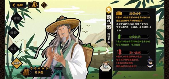 无悔华夏司马徽强不强?虽然说司马徽的风评很差…可能是受了演武的影响,也可能是受到了其他方面的影响,虽然说司马徽的风评很差…可能是受了演武的影响,也可能是受到了其他方面的影响,司马徽一共有三个技能,分别是知人之鉴、博学和淡泊,他的太守效果一般般,不建议升,家仆是水镜门