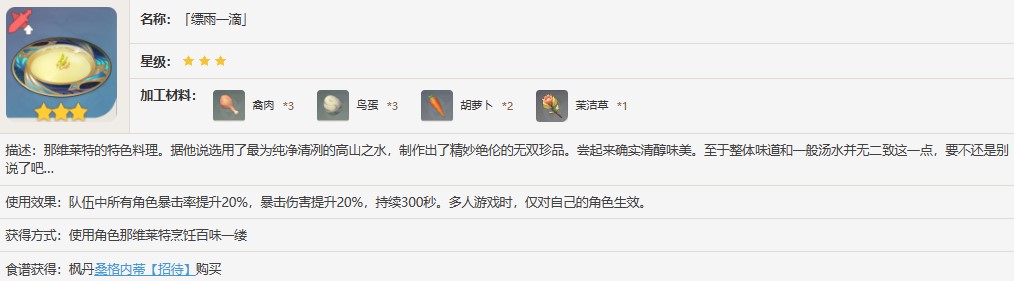 原神特色料理缥雨一滴怎么获得?缥雨一滴是维莱特餐馆的招牌菜式,一款颇具特色的汤品。该汤制作十分讲究,将各种食材悉数研磨成泥状,再与精选的高汤合炖。最终,通过精心过滤,呈现出清澈可口的汤品供食客享用。这款汤品独具匠心,每一滴都凝聚着大自然的精华,呈现出浓郁的肉质与蔬菜