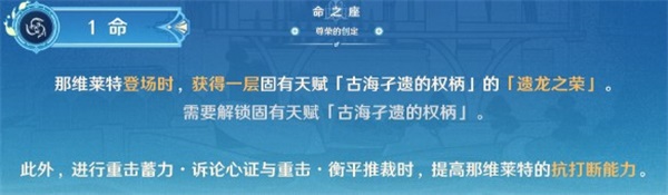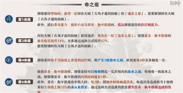 原神那维莱特一命效果是什么?那维莱特的第一个命座直接将其总伤害提升了25%,同时让他在重击期间获得霸体效果,这无疑是对护盾和四元素配队要求的彻底解放。这个强度已经达到了质变级的1命,让人不禁联想到「胡桃」的出色表现。当专武和1命只能选择一个的时候,如果有「钟离」,那么专武