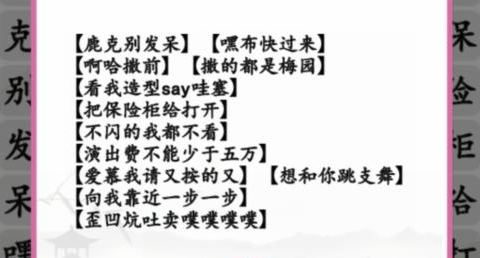 汉字找茬王今日新说唱答案是什么?进入汉字找茬王今日新说唱关卡后,横着映入眼帘的有“鹿看我造型say哇塞把”、“克啊哈撒前爱慕我保”和“别撒演想噗噗不请险”等不通顺的句子,竖着看则有“鹿克别发嘿布快”、“看啊撒的是梅园”和“我哈演出费不能少”等不通顺的句子,这样看是不是已