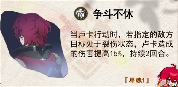崩坏星穹铁道卢卡星魂1有什么作用?卢卡的星魂名为“争斗不休”,作为增伤星魂,它为卢卡提供了一个非常独特且实用的增伤效果。只要目标选择得当,这个增伤效果几乎等于常驻,能够在卢卡的裂伤伤害和直伤伤害方面同时发挥提升作用。只要卢卡攻击的目标处于裂伤状态,他的裂伤伤害就会增加