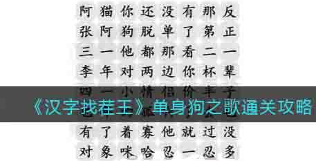 汉字找茬王单身狗之歌完成歌曲怎么过?进入汉字找茬王单身狗之歌完成歌曲关卡后,横着映入眼帘的有“阿猫你还没有那反”、“张阿狗脱单了第正”和“三一他都那看二一”等不通顺的句子,竖着看则有“阿张三李四有对悄”、“猫阿一年一年了象悄”等不通顺的句子,这样看是不是已经想起来不