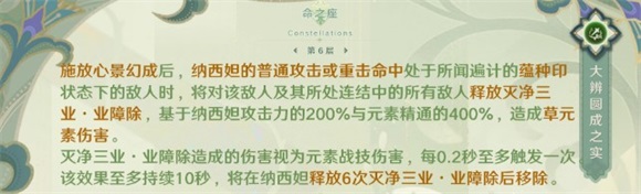 原神纳西妲六命效果是什么?纳西妲最后一个技能让她在使用心景幻成后,对处于所闻遍计的蕴种印状态下的敌人进行攻击时,会释放灭净三业·业障除,对那个敌人以及他所在的连结中的所有敌人造成草元素伤害。这个技能的伤害是基于纳西妲的攻击力和元素精通的400%,造成草元素伤害。灭净三