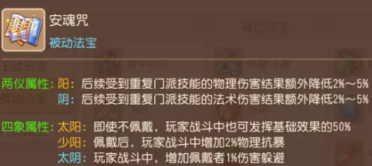 梦幻西游手游安魂咒四象属性哪个好?安魂咒法宝的太阳不用佩戴也能降低伤害,尽管只能发挥百分之五十的基础效果,在面对多狮驼或者多月宫战斗中有所发挥,但是使用场景有限,故优先级不高,两仪中的阳可以使得后续受到重复门派技能的物理伤害结果额外降低百分之二到五,阴则是可以使得后