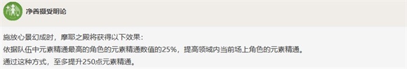 原神纳西妲固定天赋净善摄受明论有什么效果?纳西妲的净善摄受明论天赋是一个非常特别的辅助技能。当施放心景幻成时,摩耶之殿将获得一种特殊的效果,根据队伍中元素精通最高的角色的元素精通数值的25%,提高领域内当前场上角色的元素精通。但是,需要注意的是,这个加成只对在前台的角色
