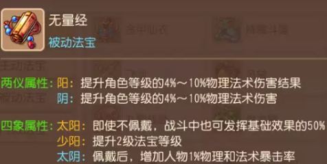 梦幻西游手游无量经四象属性哪个好?无量经是梦幻西游手游中的被动法宝,需飞剑或者附灵玉激活四象后开启,同飞剑一样是大唐必戴法宝之一,能增加门派技能的伤害结果,新手洗到哪个就用哪个,两仪中的阳可以增加玩家等级的百分之四到十的物理法术伤害结果,阴则是增加玩家等级的百分之四