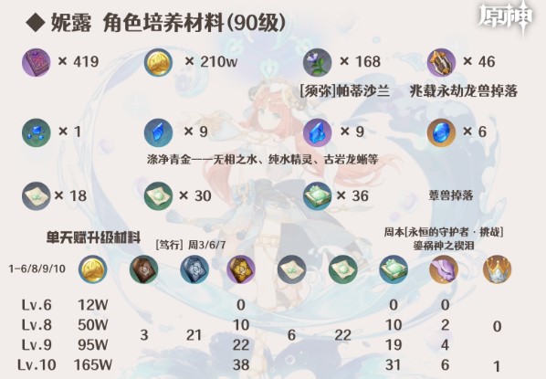 原神妮露的培养材料是什么?妮露是一位非常特殊的水元素功能型角色,她的元素战技可以触发自身的天赋,从而改变元素反应的效果。妮露的元素战技有两种效果,一种是可以施放给敌人施加潮湿效果的净天水环,另一种则是可以持续造成水元素伤害的水月。这两种效果都非常实用,可以在战斗中提