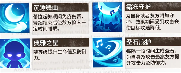 潮灵王国起源蕾拉技能是什么?蕾拉跳舞的时候心情会非常愉悦,双鱼座的姑娘,她是冰雪王国城堡里的优雅贵族小姐,对舞蹈尤为擅长,但城堡里严苛乏味的规矩生活使她感到无聊,每当如此她便会去到后院的空地里翩翩起舞,以此来消遣心中苦闷,美丽的舞姿也吸引来了她的一位特殊的朋友-雪精灵